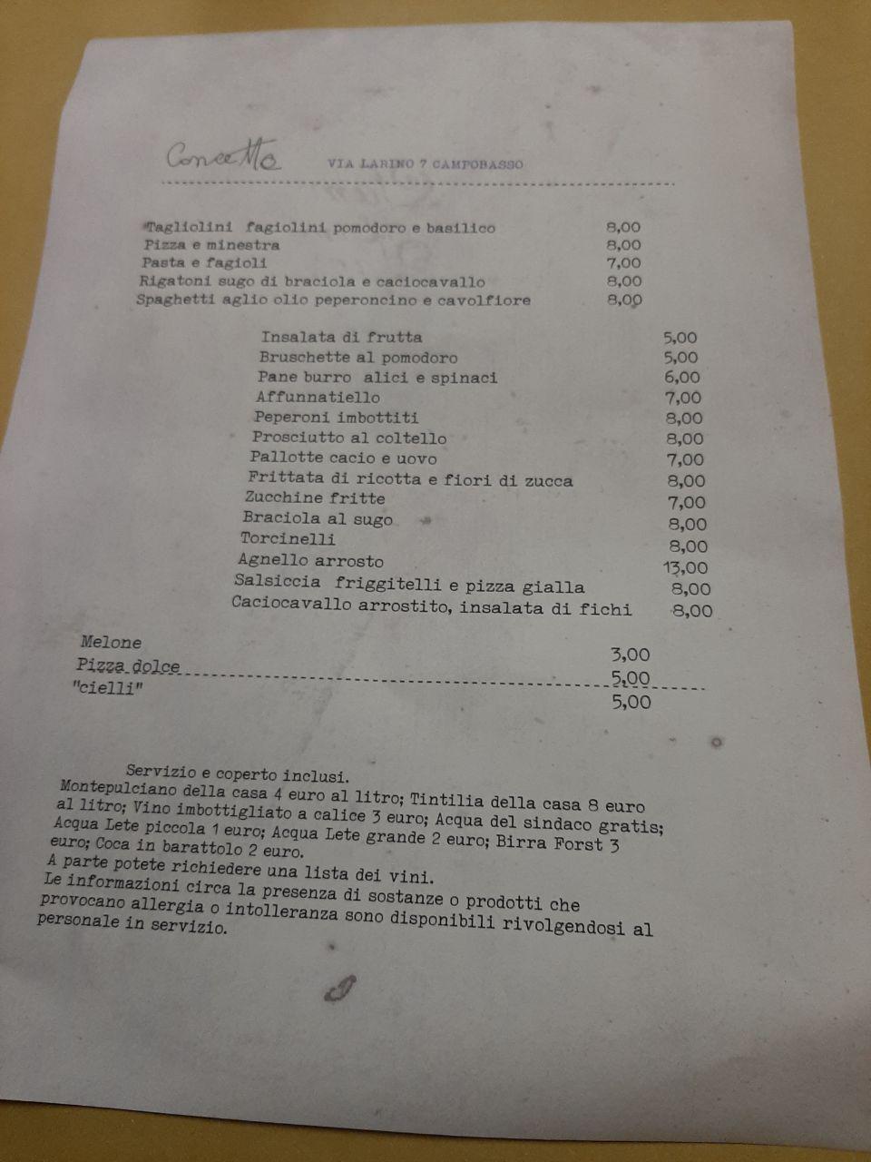I piatti tipici della cucina molisana sono serviti in un ambiente informale, con un servizio rustico e senza fronzoli. Menù stampato su foglio di carta, apparecchiatura casalinga e piatti da pranzo della domenica da zia Concetta (ma attenzione perché la domenica è chiuso).